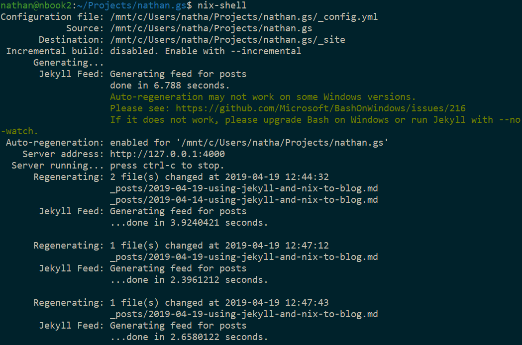 For my blogging I use Jekyll and Nix, hosted on Github Pages. Now that we have a working Nix on Windows setup, we can start to blog.